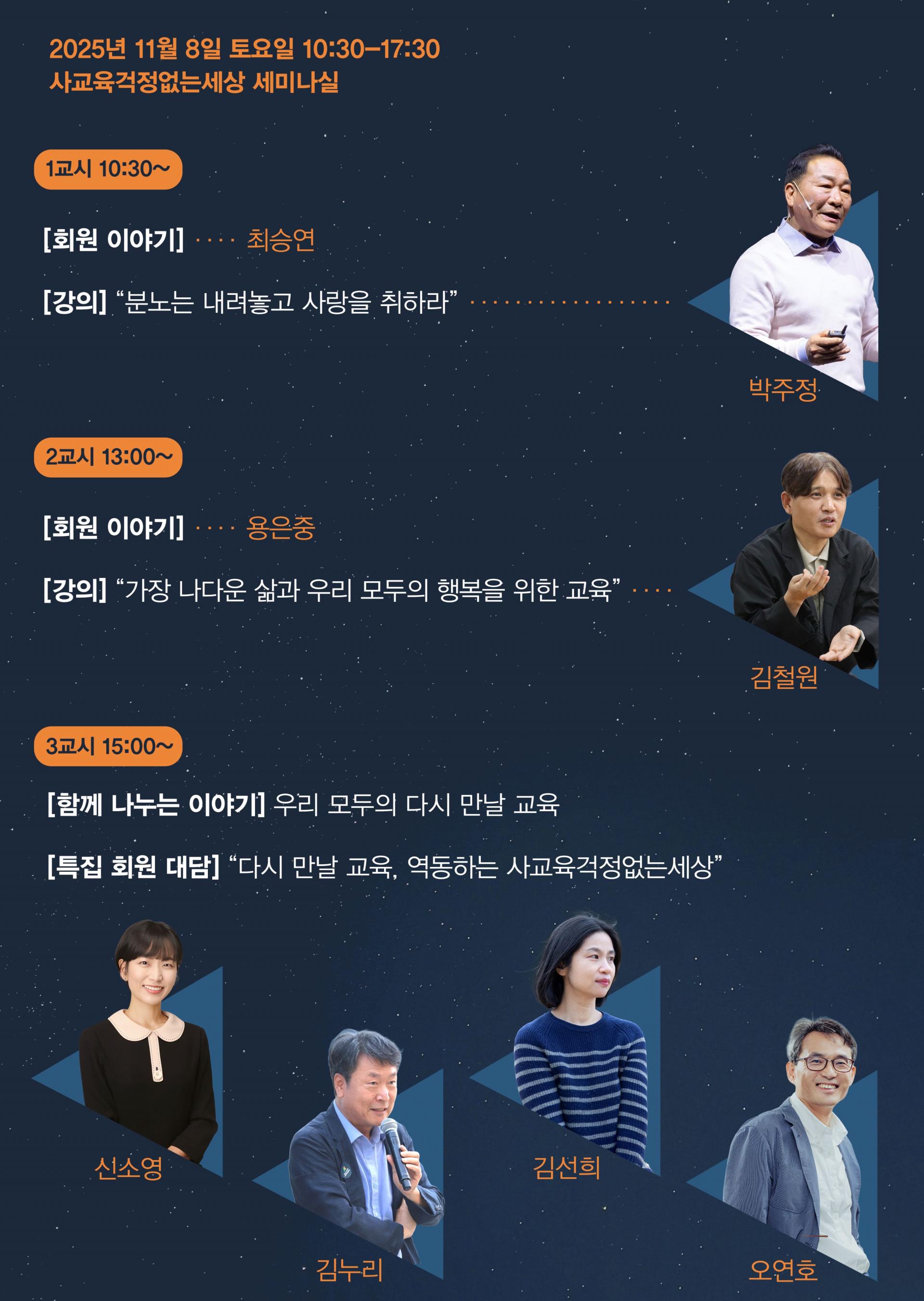 우리 교육에 대한 그의 절박함, 그리고 사명감에 대해서는 굳이 설명이 필요 없을 것이다. 바쁜 일정 속에서도 사교육걱정없는세상의 부탁이라면 늘 한걸음에 달려와 주는 고마운 동역자요 회원이다. 그는 최근 인터뷰에서 한국 교육의 가장 큰 문제를 '상상력의 부재'로 짚었다. 이번 대담은 그간의 교육 문제에 대한 예리한 비판과 성찰에 더하여, 역동하는 사교육걱정없는세상에 대한 상상의 나래를 펼치는 시간이 될 것이다.