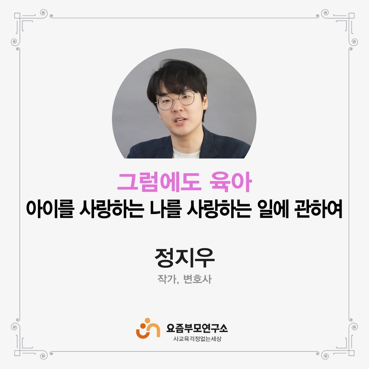 정지우 작가는 강의에서 '아이와 함께하는 시간은 디톡스'라고 말한다. 이 강의는 모든 부모가 일상으로부터 잠시 한 발짝 떨어져, 차분히 시청할 수 있다면 좋겠다. 나와 아이와, 파트너와, 우리의 삶을 재조명하게 되는 시간. 바로 이 강의가 디톡스다.